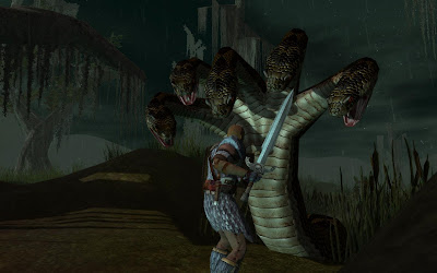 Finally, the hydra is finished and uploaded to the Neverwinter Vault and the Neverwinter Nexus . I made a tintable and non-tintable version of the model, as can be seen below. I'll rig and upload the one-headed version soon. For now, I need sleep. Zzzzz. Edit, 29 May 2012. Some time ago, I posted a thread regarding this creature in the NWN2 Custom Content forum at the Bioware Boards. When I announced the release of the hydra, a few people started trying it out. As of this writing, MokahTGS posted a test module with hydra variants in it for other players to try and contribute modifications to. Anyone interested may head over to my Big Snake thread to apprise themselves of the latest developments and perhaps contribute to improving the creature's blueprint.